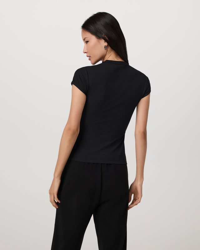 Elevate your short sleeve collection with the Pose Button Up. Designed with our lush stretch rib knit, this women’s button-up crewneck is soft to the touch and sits close to the body.