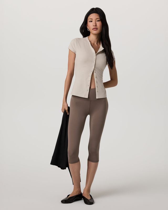 Elevate your short sleeve collection with the Pose Button Up. Designed with our lush stretch rib knit, this women’s button-up crewneck is soft to the touch and sits close to the body.