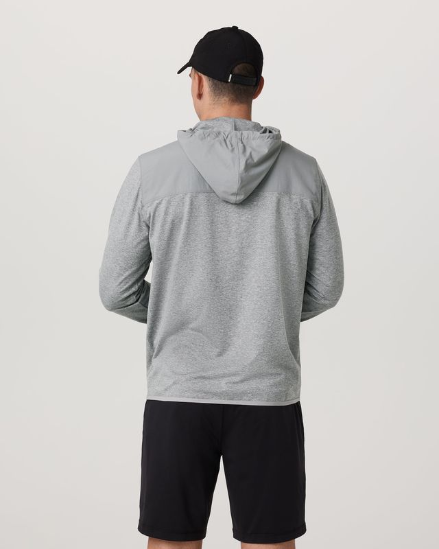 This jacket checks the boxes for both soft performance stretch knit plus a protective nylon shell from 88% recycled material to help protect from the elements. Moisture-wicking fabric along with nylon overlays, a drawcord hoodie, and zip pockets keep you in check. Great for training and running.