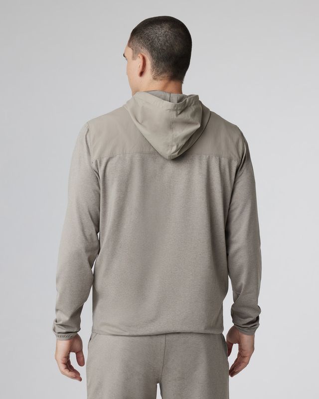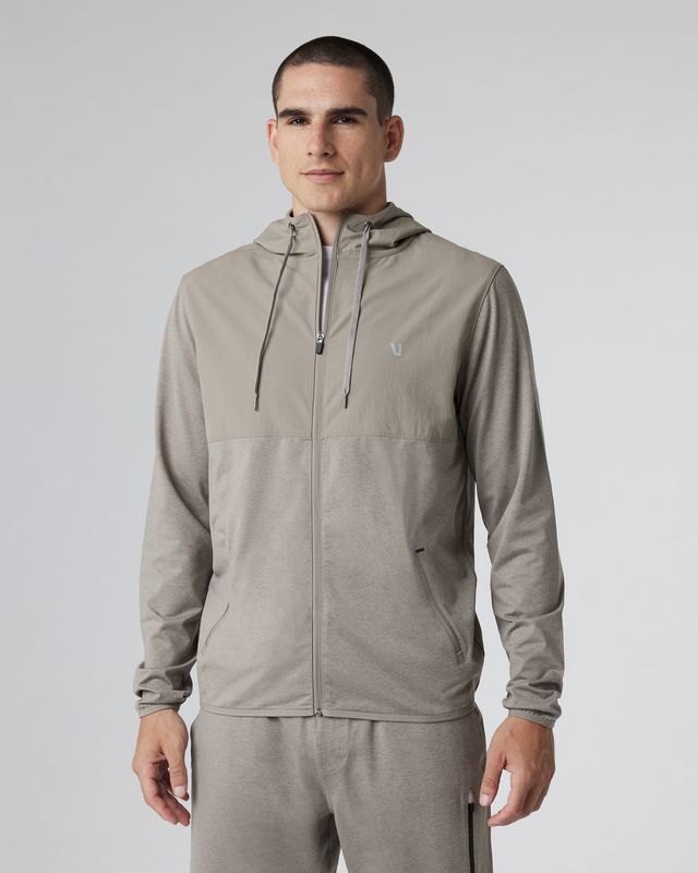 This jacket checks the boxes for both soft performance stretch knit plus protective nylon, making it perfect for comfortable outdoor wear. Moisture-wicking fabric along with nylon overlays, a drawcord hoodie, and zip pockets keep you in check. Great for training and running.