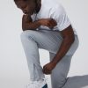 Track pant style in a super soft stretch knit. Built to sprint or to sprawl out, these moisture-wicking bottoms are finished with front and back pockets and zippered hemlines.