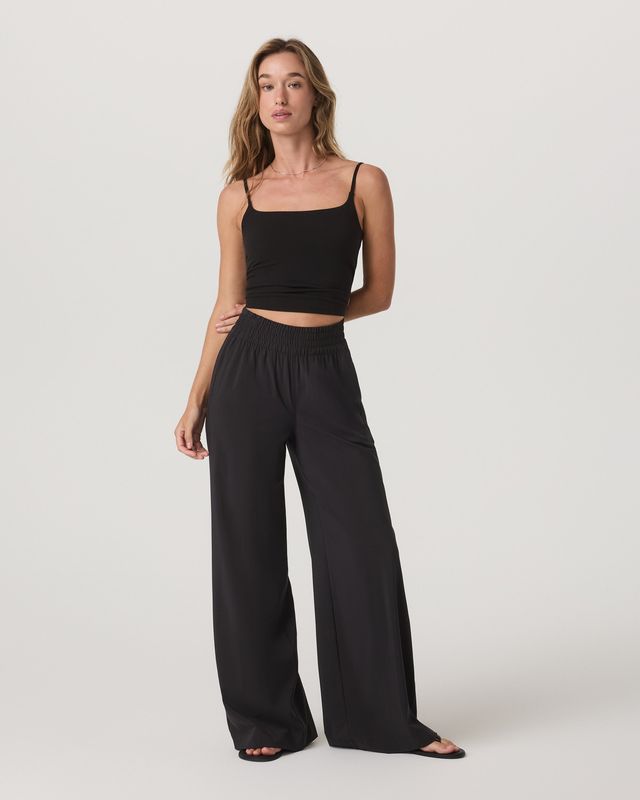 Feel ready to move. The ultra wide-leg pant in our silky soft, partly recycled performance stretch fabric is naturally wrinkle-free and moisture-wicking. With a relaxed fit, soft elastic waistband, and silk-like fabric, the Villa Wideleg is a modern basic that will be your new suitcase staple. This pant is styled long for a breezy look—let the hems sweep the ground or wear it with a heel.