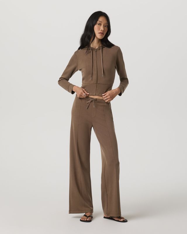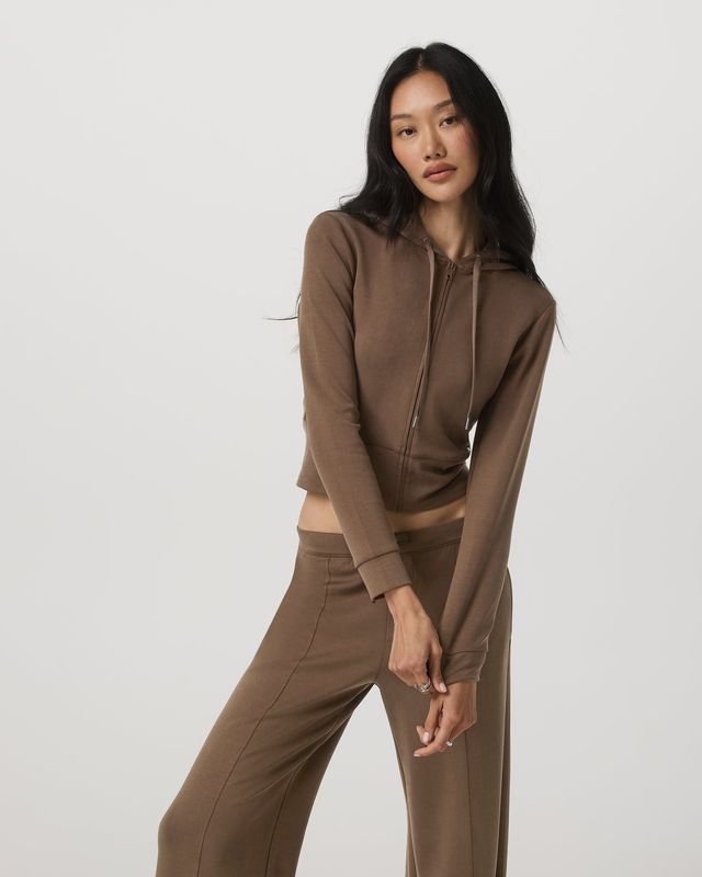 The Compose Full Zip Hoodie is a modern take on a zip-up with a wide ribbed waistband and matching cuffs. It’s crafted with a soft, lightly textured sandwash knit. We love wearing this women’s jacket with the Compose Wideleg Pant on rest days. Designed to mimic your favorite vintage hoodie, the fabric color naturally softens over time for a lived-in, well worn look.