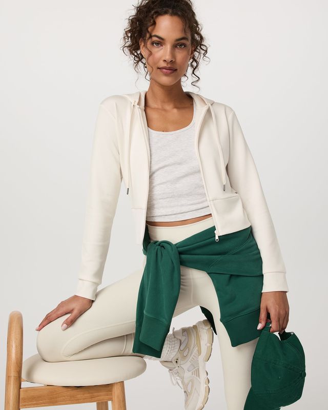 The Compose Full Zip Hoodie is a modern take on a zip-up with a wide ribbed waistband and matching cuffs. It’s crafted with a soft, lightly textured sandwash knit. We love wearing this women’s jacket with the Compose Wideleg Pant on rest days. Designed to mimic your favorite vintage hoodie, the fabric color naturally softens over time for a lived-in, well worn look.