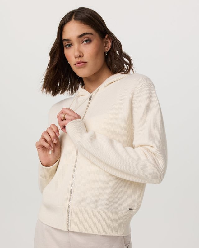 The Émilie Full Zip Cashmere Rib Hoodie brings luxury to a laid-back hooded style. Crafted from 100% cashmere with 60% recycled cashmere, this women’s sweater features a full front zipper and effortlessly relaxed fit.