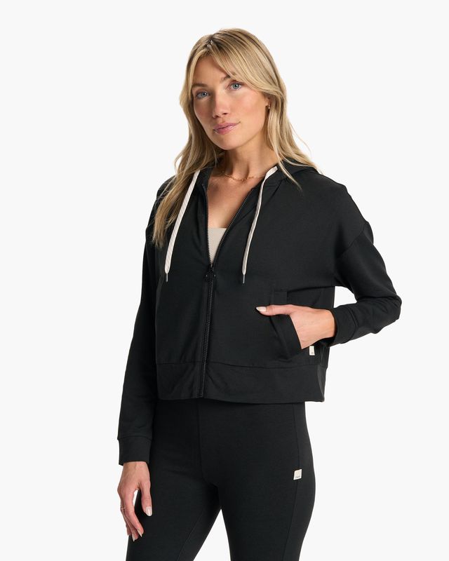 Might show up early, might stay at home. This full-zip hoodie is good either way with its soft and cozy performance stretch knit and just-right cropped length.