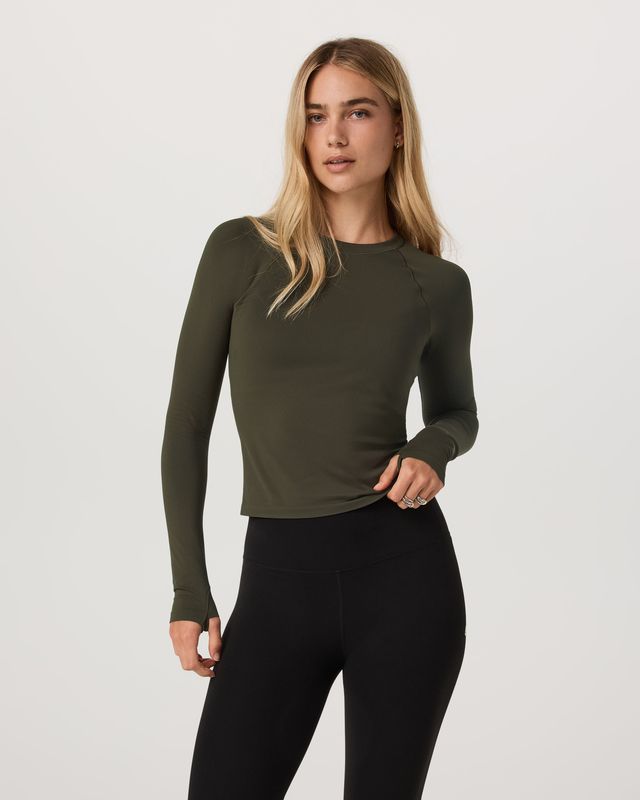 A performance long sleeve with unlimited wearability, this top has a sleek, seamless construction and zero side stitching to reduce chafing for maximum comfort. It has wide rib binding, raglan sleeves with thumb hole cuffs, and mesh side panels for enhanced airflow.