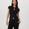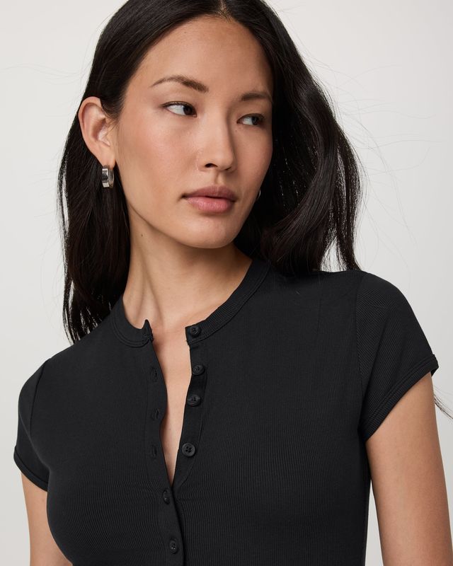 Elevate your short sleeve collection with the Pose Button Up. Designed with our lush stretch rib knit, this women’s button-up crewneck is soft to the touch and sits close to the body.