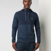 This jacket checks the boxes for both soft performance stretch knit plus a protective nylon shell from 88% recycled material to help protect from the elements. Moisture-wicking fabric along with nylon overlays, a drawcord hoodie, and zip pockets keep you in check. Great for training and running.