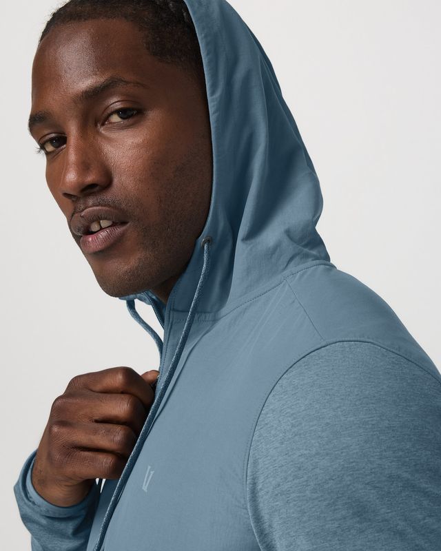 This jacket checks the boxes for both soft performance stretch knit plus a protective nylon shell from 88% recycled material to help protect from the elements. Moisture-wicking fabric along with nylon overlays, a drawcord hoodie, and zip pockets keep you in check. Great for training and running.