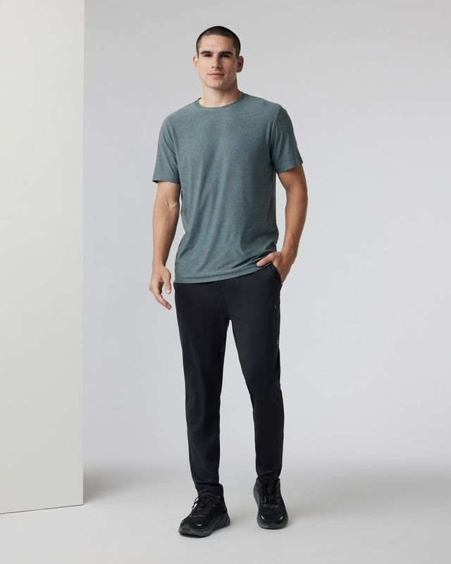 The loved Sunday fabric now in a tailored track pant silhouette. We revamped the style to have the loved thigh zip pocket while removing the zips at the bottom hem. We did this to give the customer a new silhouette in the Sunday family without the constraint of the gusset at the bottom hem zip.