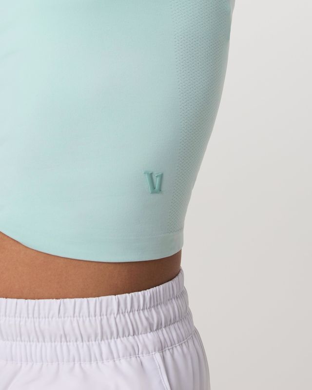 A performance tank with unlimited wearability, this top has a sleek, seamless construction and zero side stitching to reduce chafing for maximum comfort. It has wide rib binding, a higher neckline tailored for sports bras, and mesh side panels for enhanced airflow.